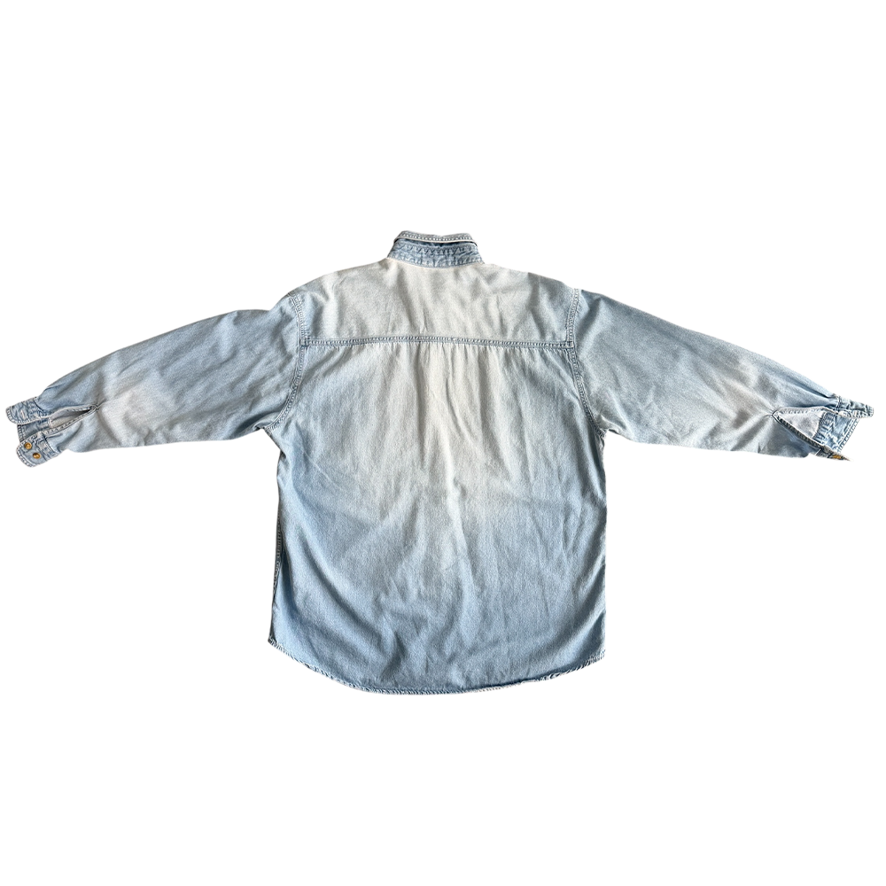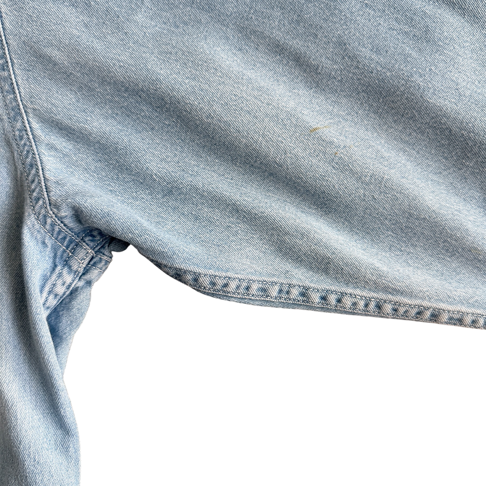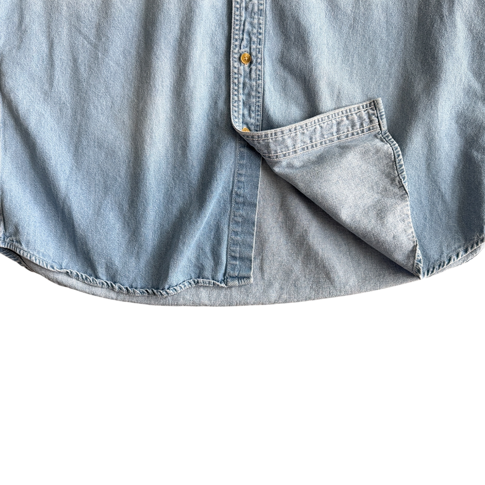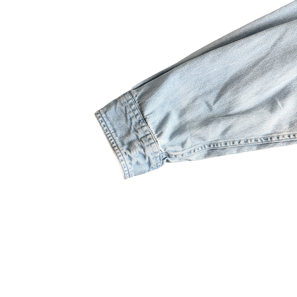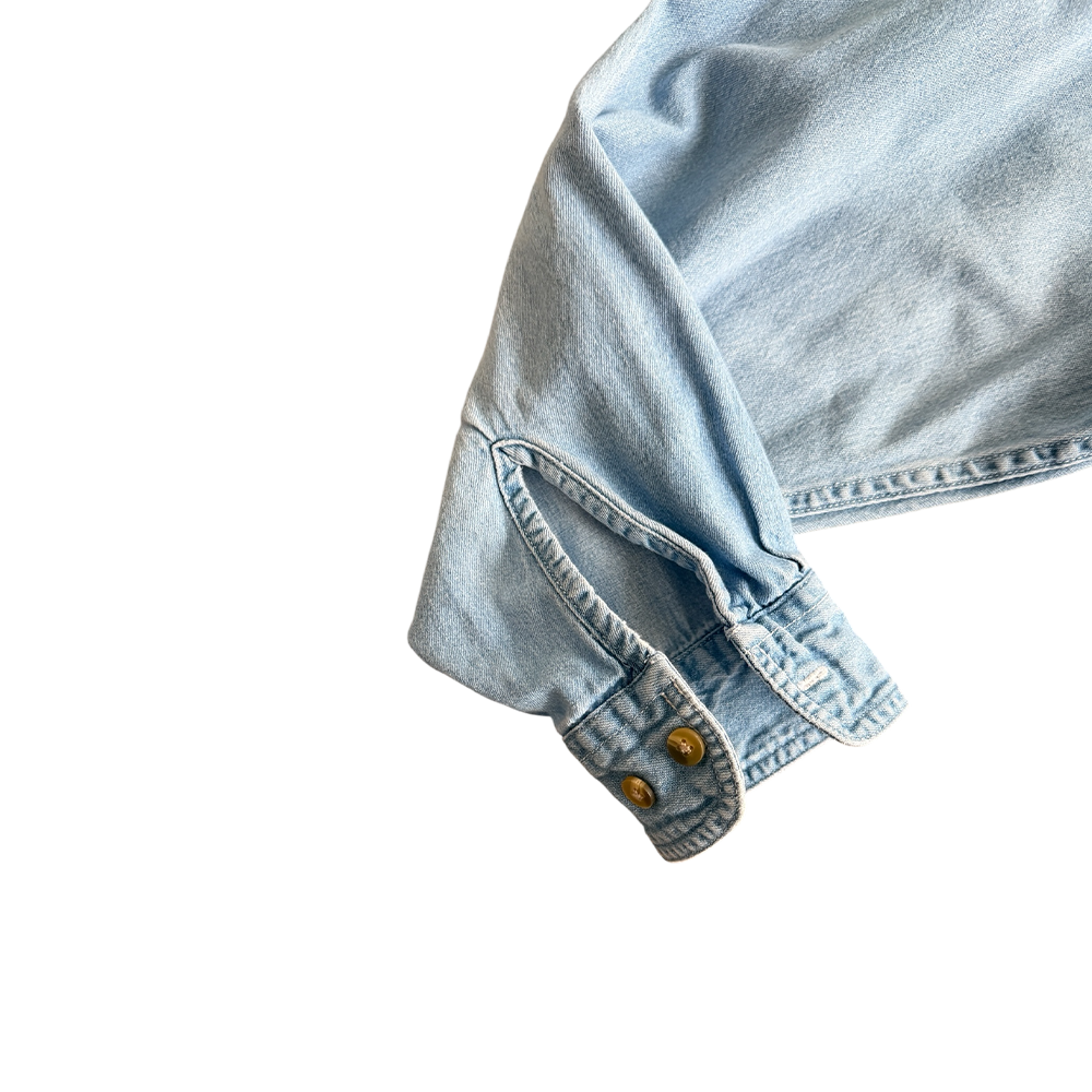 + Light wash blue denim long sleeve button down