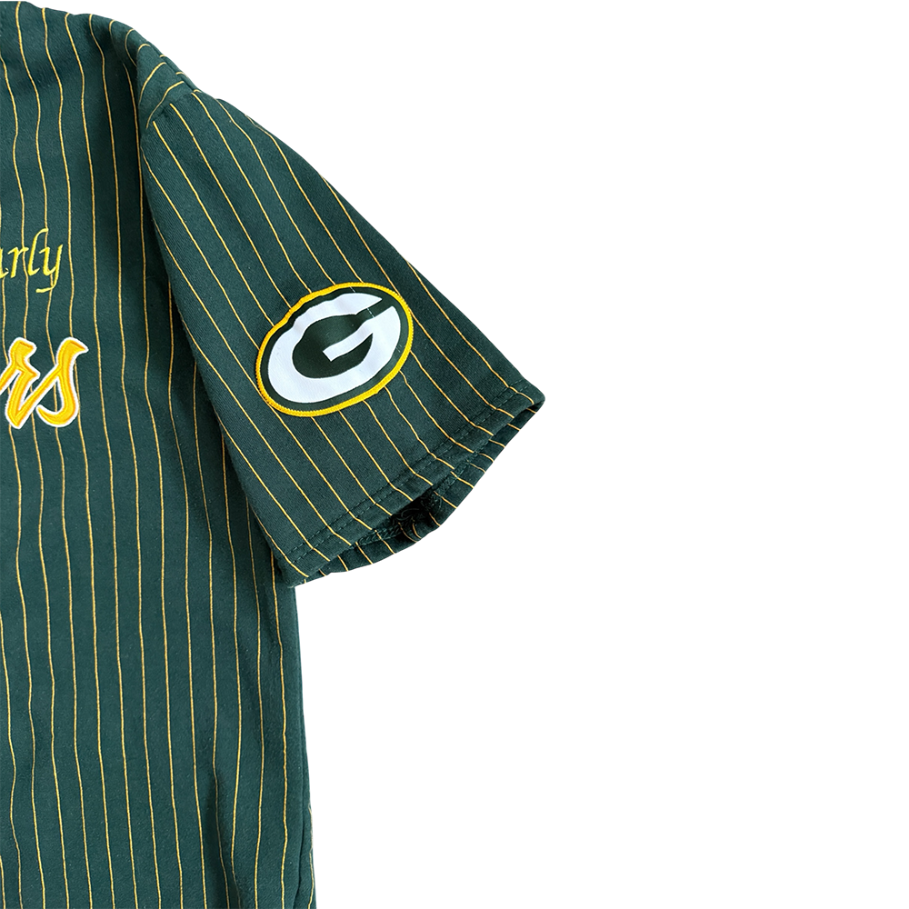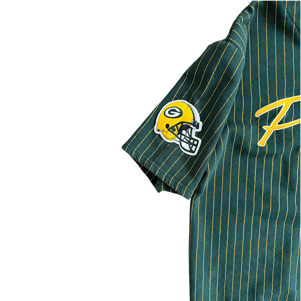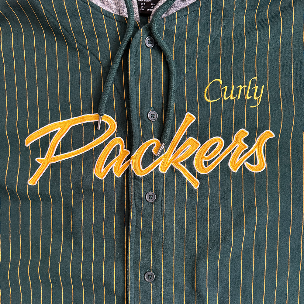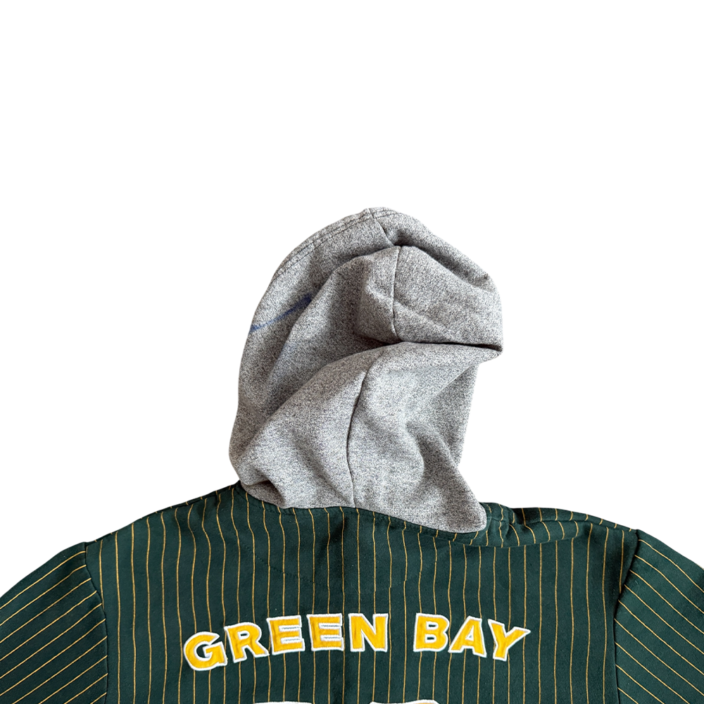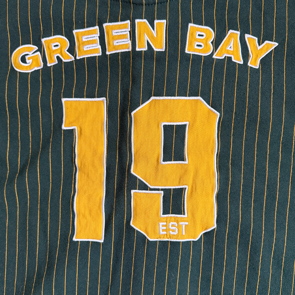 + Original embroidery: "Packers" (gold/white, center), Packers helmet (right sleeve), Packers "G" logo (left sleeve)