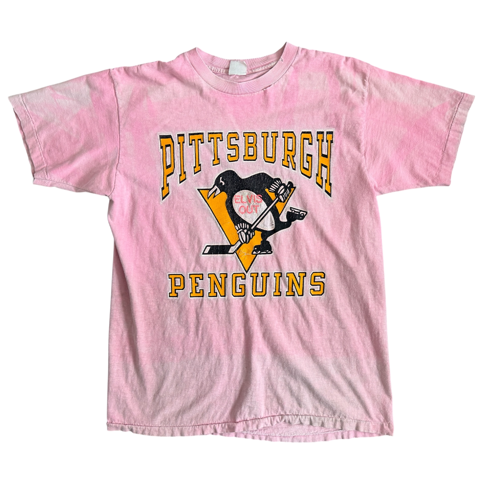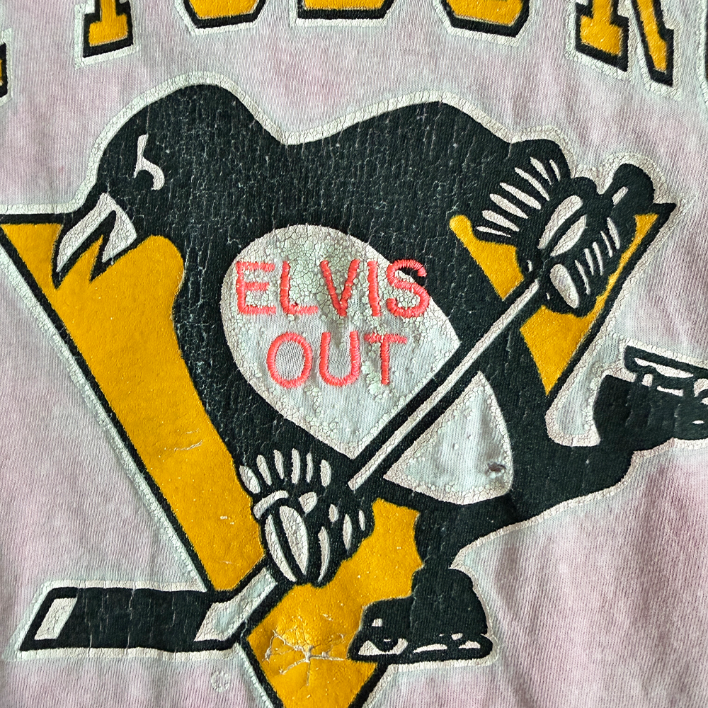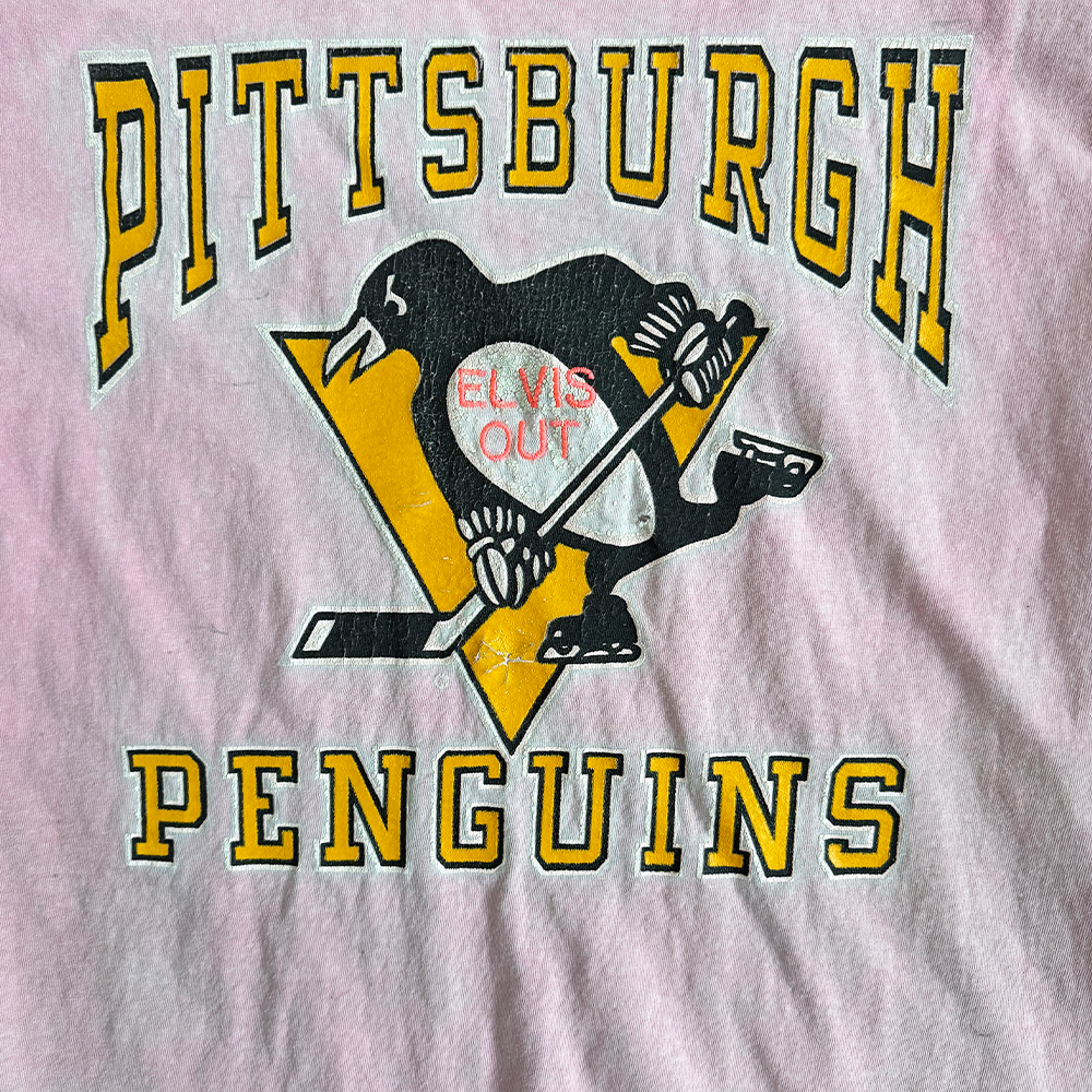 + T-shirt text: "Pittsburgh Penguins" (cracked gold/black/white)